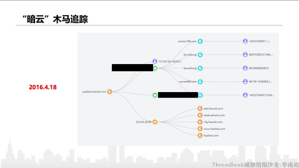 再说一下暗云木马的追踪。这张图是在16年4月18号我们通过溯源系统得到的结果。
