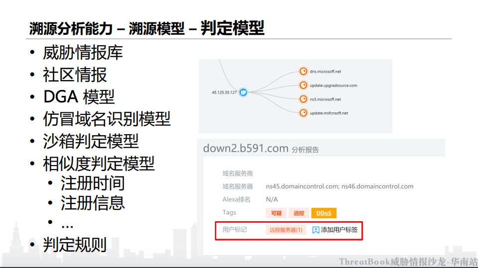 过滤之后是判定。判定的方法也有几个维度。第一,微步在线在云端有数十万量级的商业情报库;第二,我们自建了微步在线情报社区,每年有很多热心的用户给我们提交每年几十万的情报。一个典型的例子就是图上的down2.b591.com,这是我们一个用户提交的域名,最后被我们发现其实是一个主控域名。第三是类似DGA的随机域名识别,正常域名可能不大用DGA模型去识别,只有一些恶意软件和木马为了躲避检测才会使用DGA的算法,我们就可以通过这些模型去识别出随机域名,然后对它做一个恶意判定。