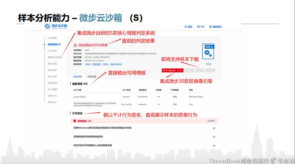 在溯源分析完成之后,我们可以把这些结果存储到数据库,我们有一个监控追踪系统,每天更新黑客画像系统里面录入的域名、cc等信息。我们先做一个监控,可以在第一时间发现它们的一些变化,这是具体的方法论。而样本分析能力是所有安全分析师都必须具备的一种能力,我们通过多引擎或者沙箱去做分析,然后提取出像引擎的病毒名、家族名、主控域名等信息,还有像Yara行为签名、ATT&CK模型等。我们微步在线其实也有一款微步在线云沙箱,从2015年公司创立,就已经在内部研发并使用,只不过我们在2017年底才开始计划把它拿到前台,目前已经上线,还在beta阶段。