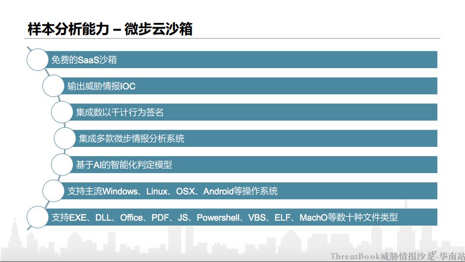 目前沙箱已经支持了主流Windows、Linux、安卓等主流操作系统,数十种文件类型。区别于其他传统厂商提供的沙箱服务,我们的沙箱能够直接判定某个样本是恶意还是非恶意,判定结果基于我们机器学习的决策树算法。另外,我们的沙箱中也集成了微步在线五款情报分析系统,提取出来的情报IOC可以直接在报告里面反馈给用户,用户拿到这些IOC后,可以放到设备里面去做检测和拦截。
