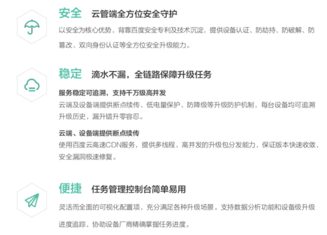 百度安全OTA背靠百度安全19年互联网安全实践和技术积淀,具备三大优势,其一,在安全审计、传输安全、升级策略、升级过程及升级包防护、云端防护、KMS秘钥管理等方面均有过硬的技术服务能力;其二,具备大型项目开发经验,服务稳定可追溯,可支持千万级高并发,稳定可靠;其三,服务接入简单,任务管理控制台简单易用,可实现操作低门槛、下发条件灵活配置、数据分析详尽等。
