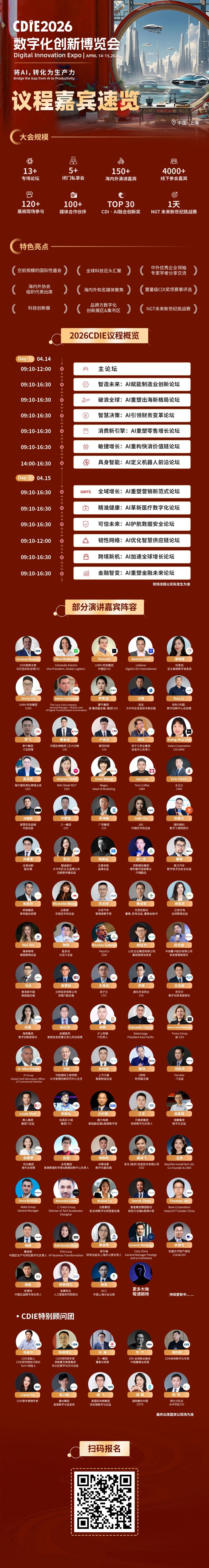 2026年4月14日-15日,第十二届CDIE数字化创新博览会将在中国上海重磅举办。本届大会以“将AI,转化为生产力”为核心主题,深度聚焦人工智能与产业数字化的融合落地,通过多元论坛、行业展览、权威评选、创新赛事等全维度内容,搭建连接中国与世界的数字化创新价值平台,助力企业将 AI 技术系统、规模化转化为真实增长动能。