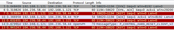 今日openVPN连不上了,抓包发现刚一握手结束便收到了一个RST包,导致一直连不上。