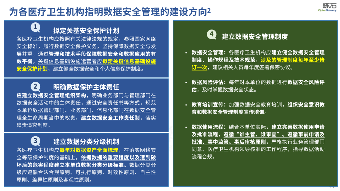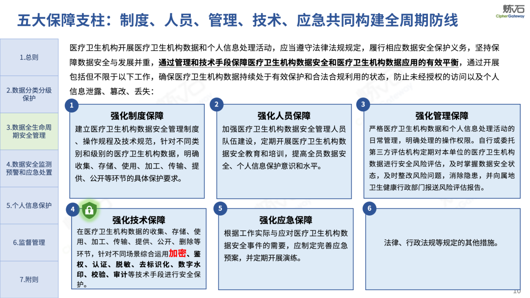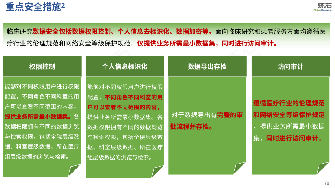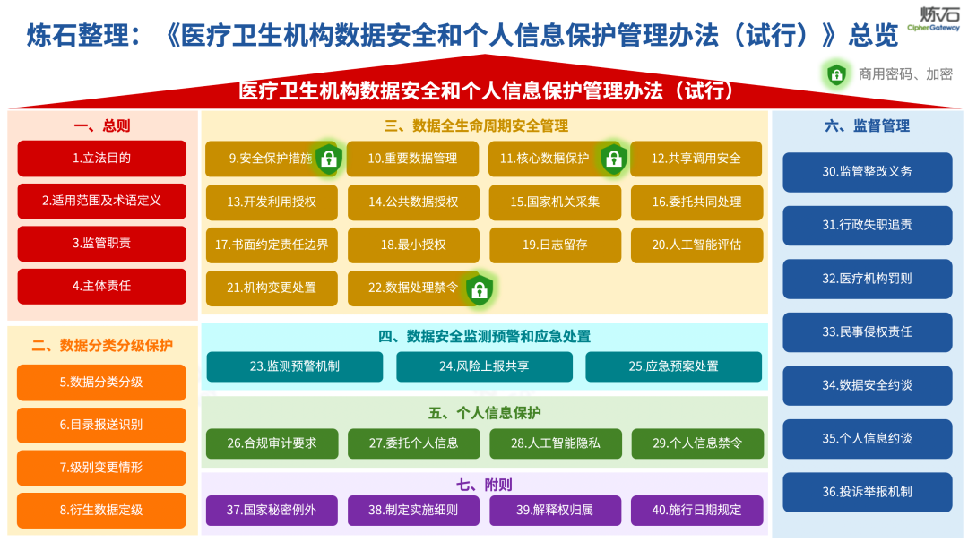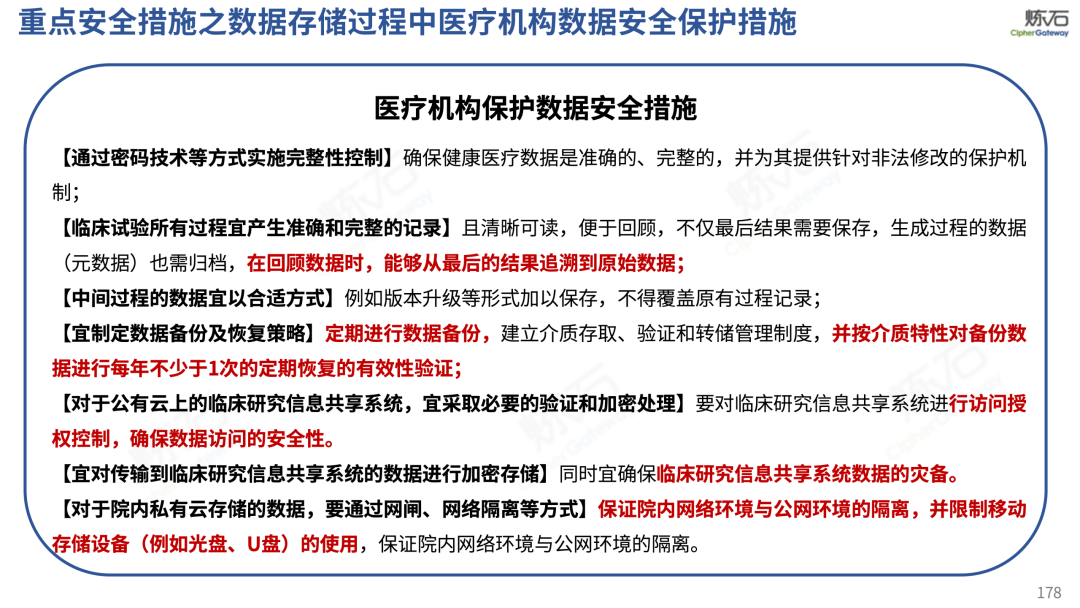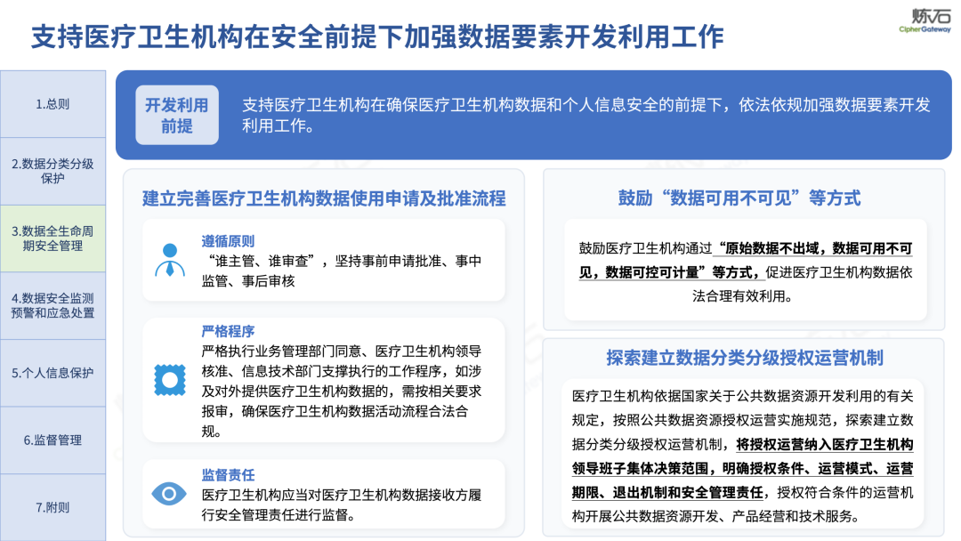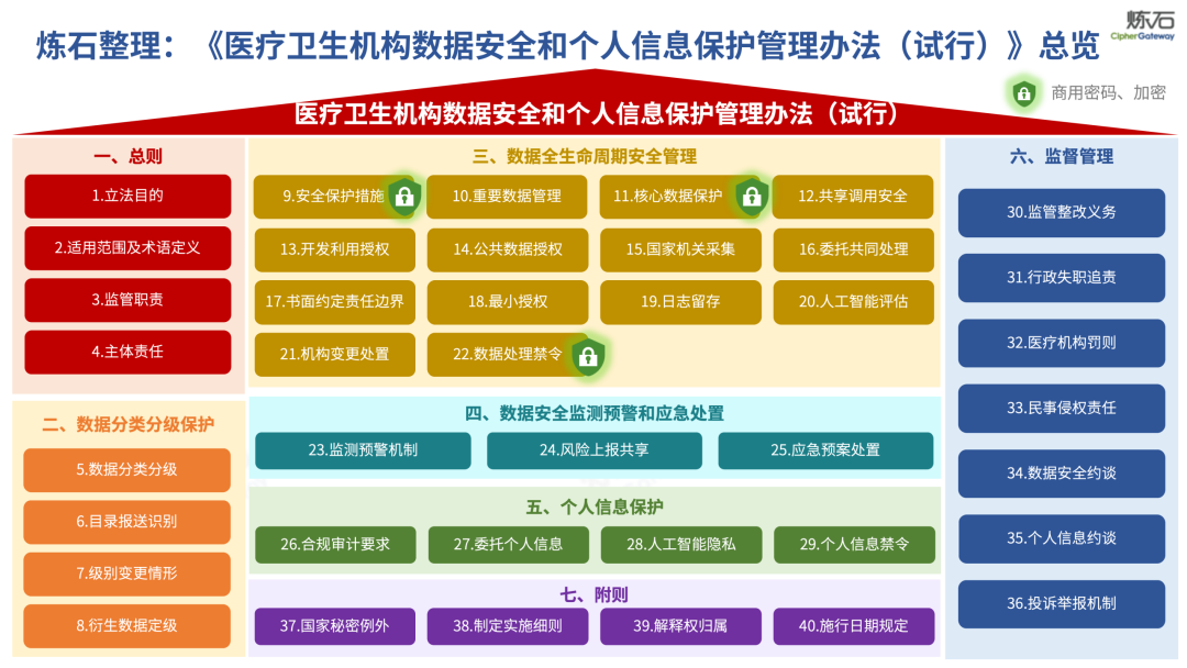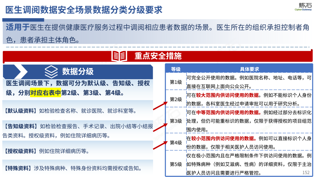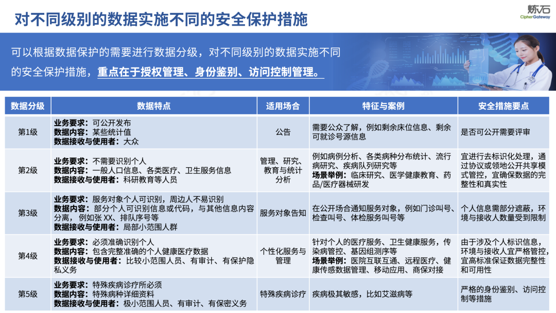 场景为用,落地八大典型安全路径。一图胜千言,炼石以图解形式对《办法》开展系统性解读,聚焦医疗数据安全制度体系,全面梳理医疗行业国家政策、技术与管理要求以及典型场景安全需求,结合医疗卫生安全、电子病历和智慧医疗等国家政策规定,围绕数据分类分级、流通数据保护、数据安全技术和组织管理保障等关键维度,细化医生调阅数据安全、患者查询数据安全、临床研究数据安全、二次利用数据安全、健康传感数据安全、移动应用数据安全、商保对接数据安全、医疗器械数据安全等八大典型场景的安全落地路径。同时,立足医疗行业实践,提炼形成可操作、可落地的医疗数据安全建设方案。