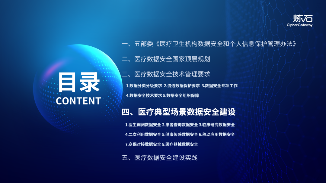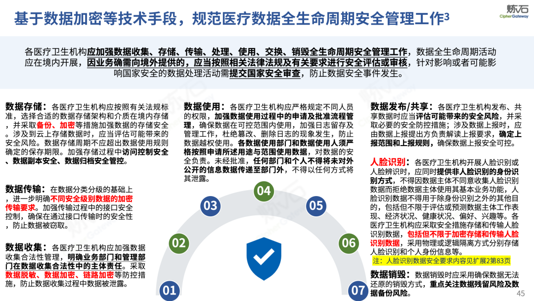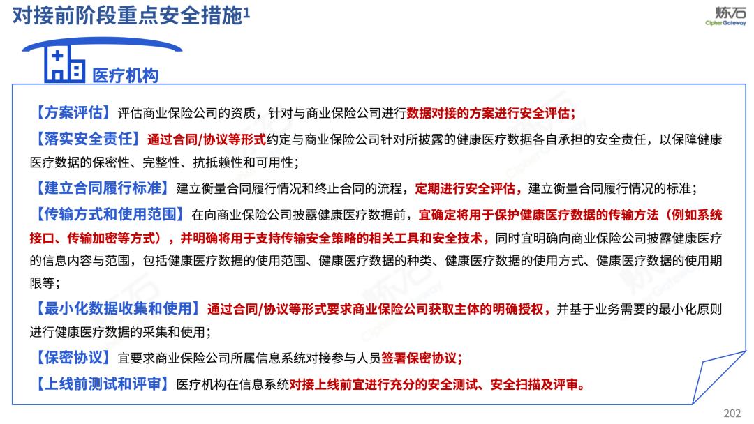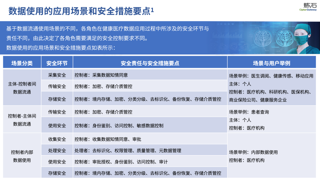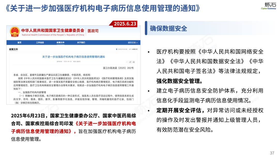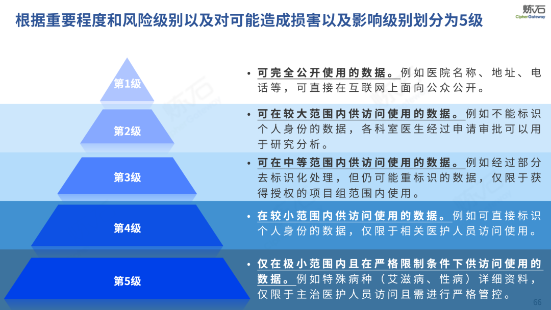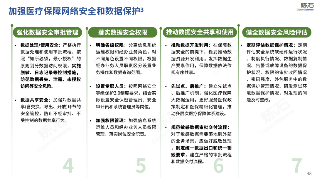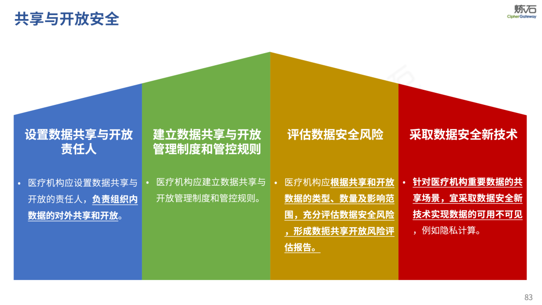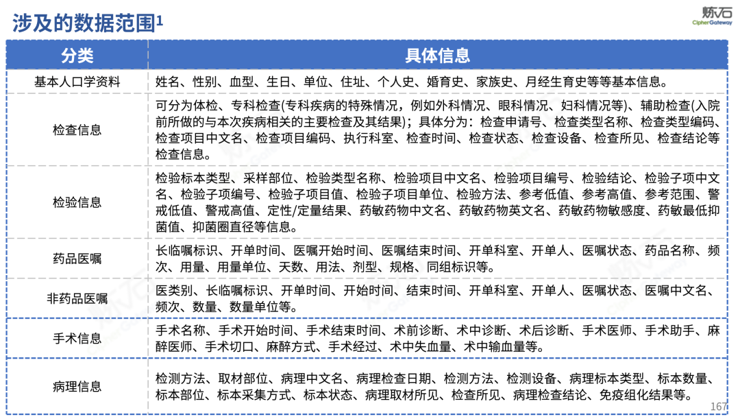 场景为用,落地八大典型安全路径。一图胜千言,炼石以图解形式对《办法》开展系统性解读,聚焦医疗数据安全制度体系,全面梳理医疗行业国家政策、技术与管理要求以及典型场景安全需求,结合医疗卫生安全、电子病历和智慧医疗等国家政策规定,围绕数据分类分级、流通数据保护、数据安全技术和组织管理保障等关键维度,细化医生调阅数据安全、患者查询数据安全、临床研究数据安全、二次利用数据安全、健康传感数据安全、移动应用数据安全、商保对接数据安全、医疗器械数据安全等八大典型场景的安全落地路径。同时,立足医疗行业实践,提炼形成可操作、可落地的医疗数据安全建设方案。