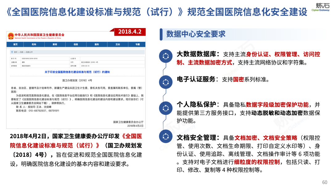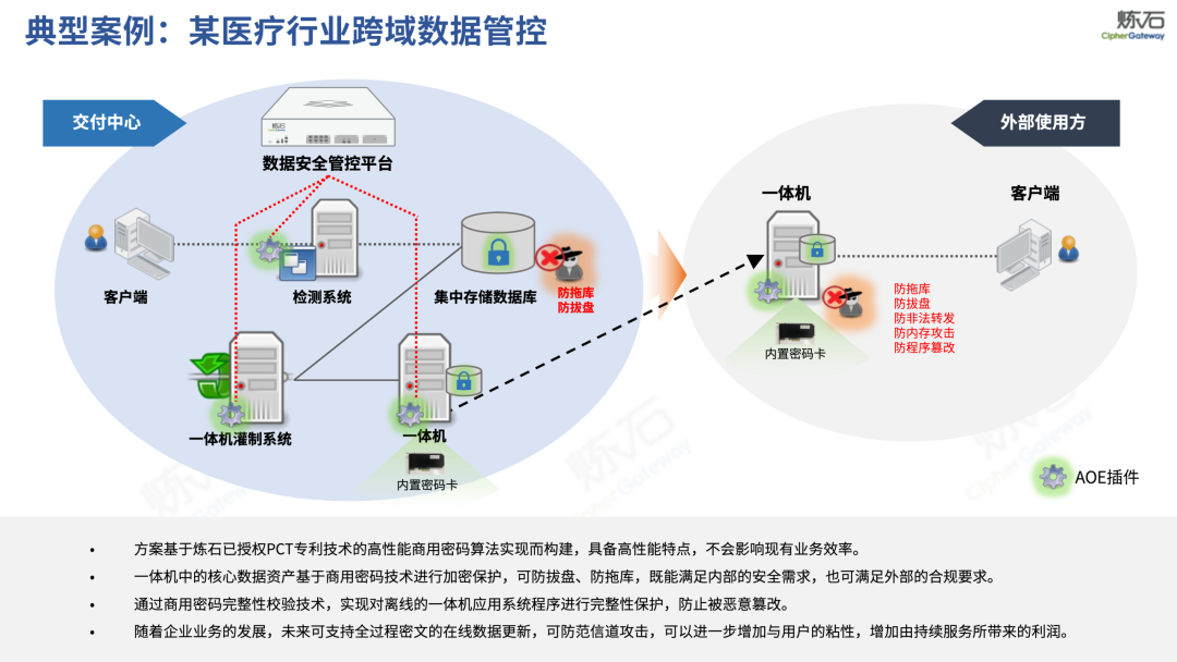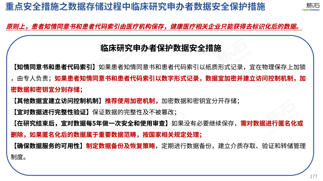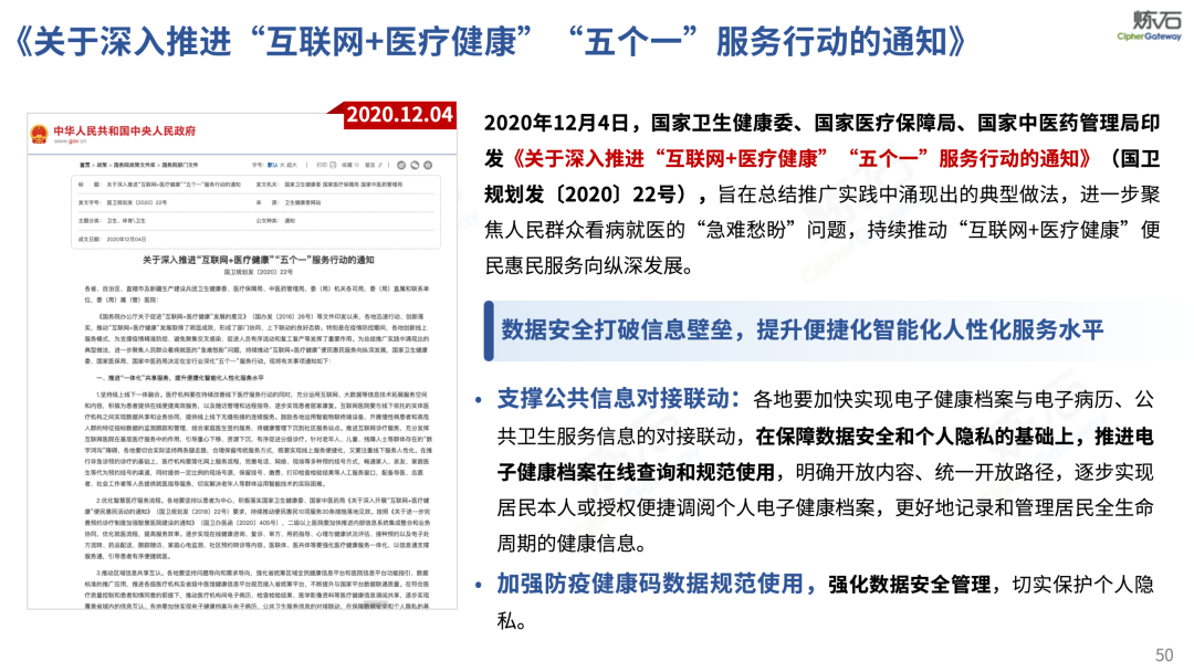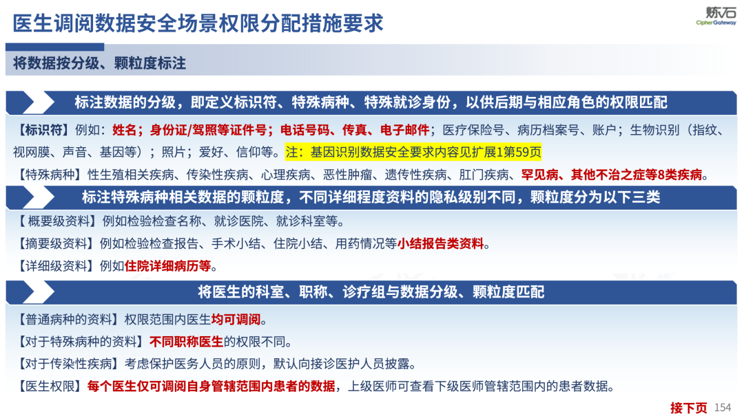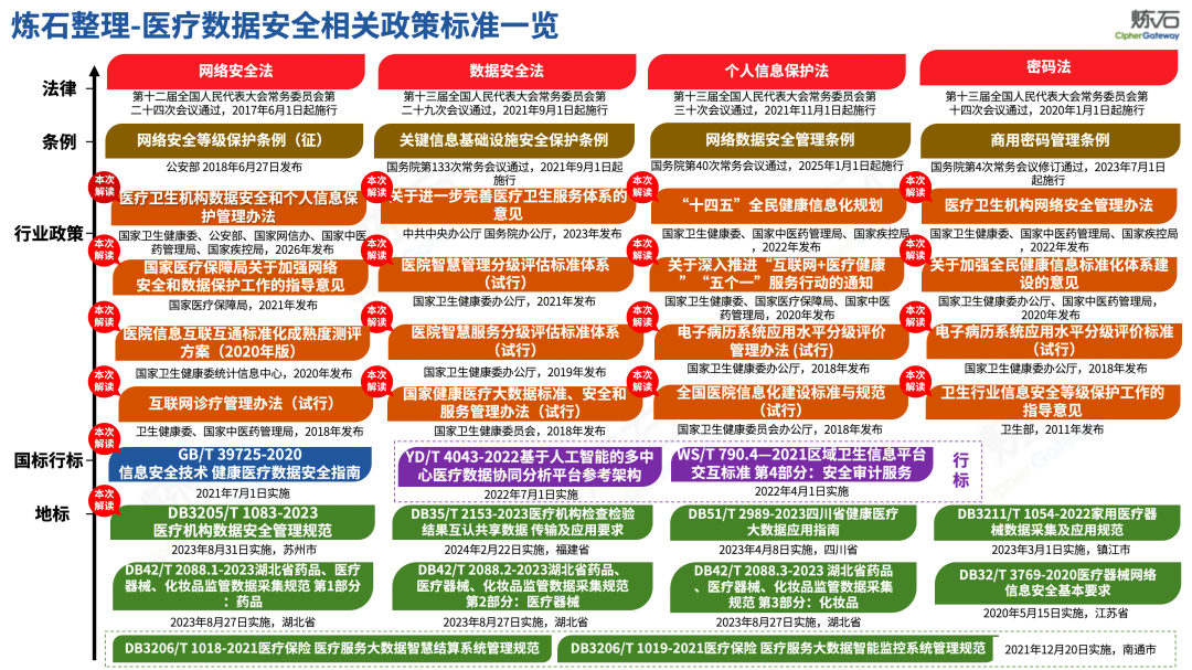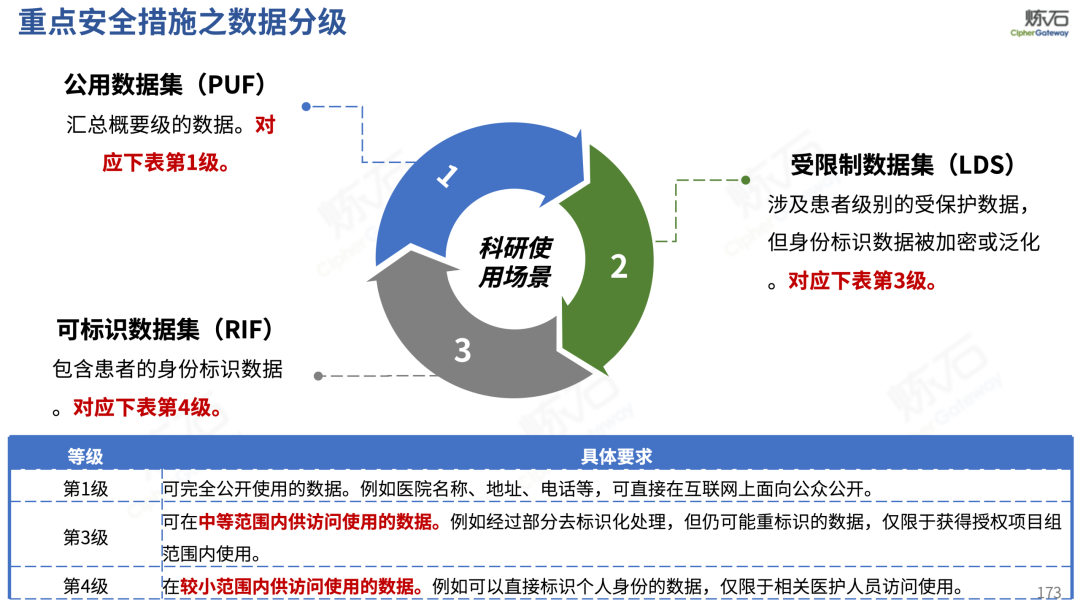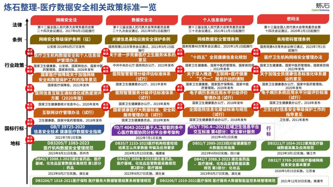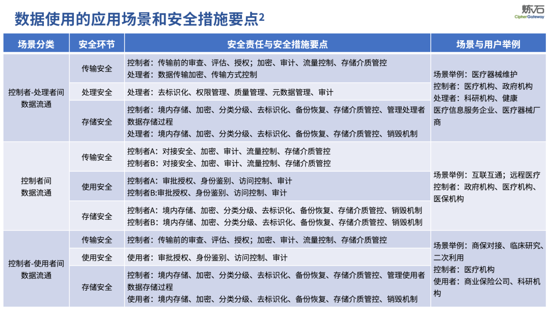 场景为用,落地八大典型安全路径。一图胜千言,炼石以图解形式对《办法》开展系统性解读,聚焦医疗数据安全制度体系,全面梳理医疗行业国家政策、技术与管理要求以及典型场景安全需求,结合医疗卫生安全、电子病历和智慧医疗等国家政策规定,围绕数据分类分级、流通数据保护、数据安全技术和组织管理保障等关键维度,细化医生调阅数据安全、患者查询数据安全、临床研究数据安全、二次利用数据安全、健康传感数据安全、移动应用数据安全、商保对接数据安全、医疗器械数据安全等八大典型场景的安全落地路径。同时,立足医疗行业实践,提炼形成可操作、可落地的医疗数据安全建设方案。