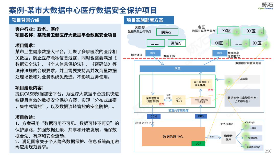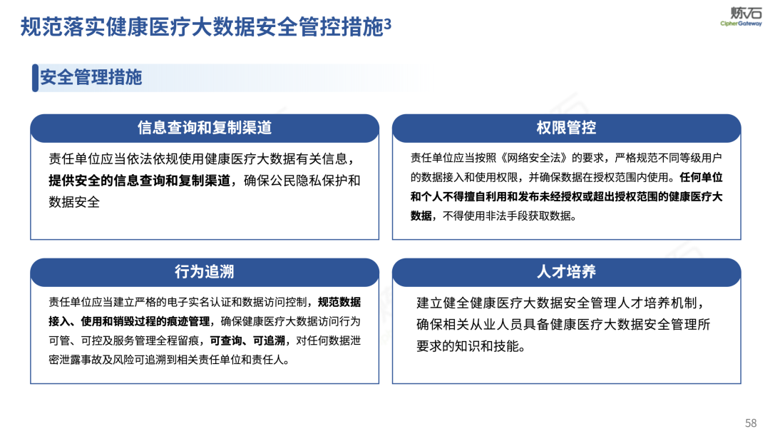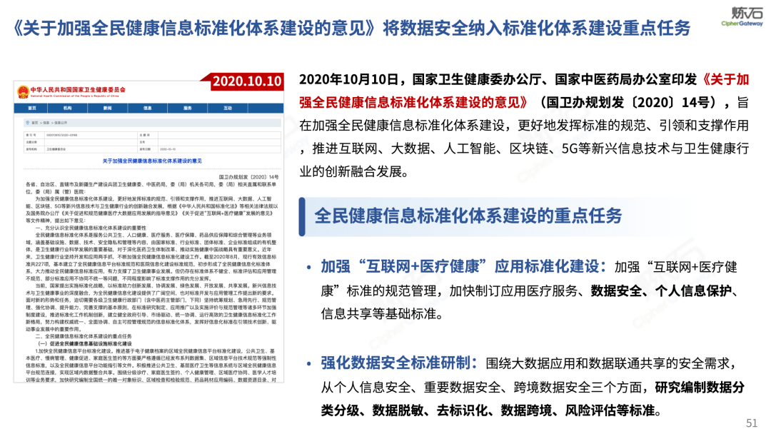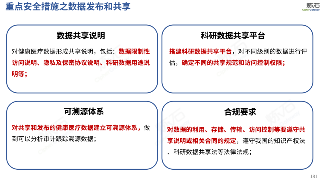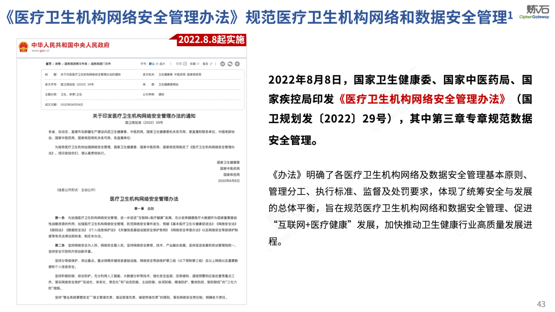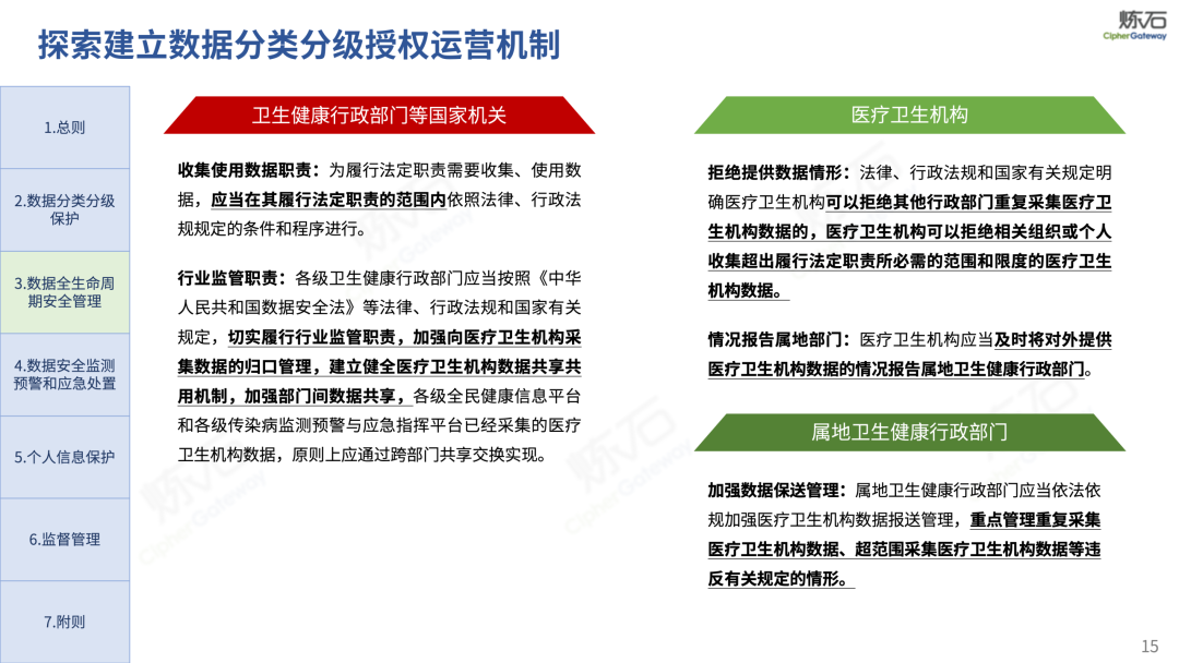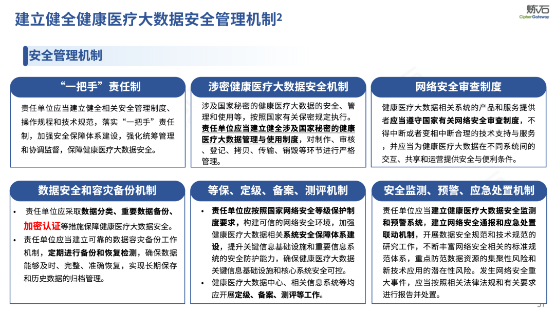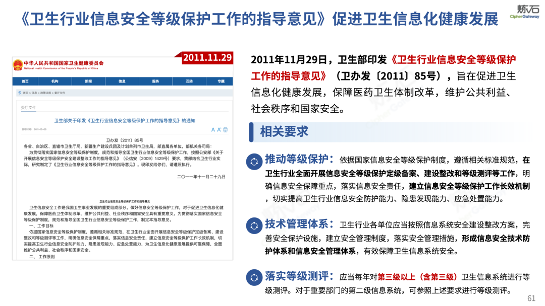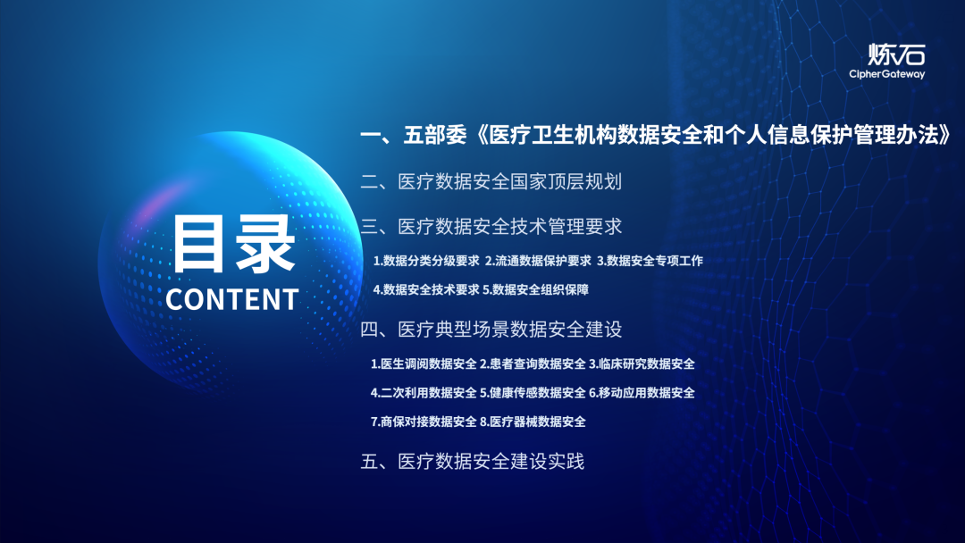 场景为用,落地八大典型安全路径。一图胜千言,炼石以图解形式对《办法》开展系统性解读,聚焦医疗数据安全制度体系,全面梳理医疗行业国家政策、技术与管理要求以及典型场景安全需求,结合医疗卫生安全、电子病历和智慧医疗等国家政策规定,围绕数据分类分级、流通数据保护、数据安全技术和组织管理保障等关键维度,细化医生调阅数据安全、患者查询数据安全、临床研究数据安全、二次利用数据安全、健康传感数据安全、移动应用数据安全、商保对接数据安全、医疗器械数据安全等八大典型场景的安全落地路径。同时,立足医疗行业实践,提炼形成可操作、可落地的医疗数据安全建设方案。