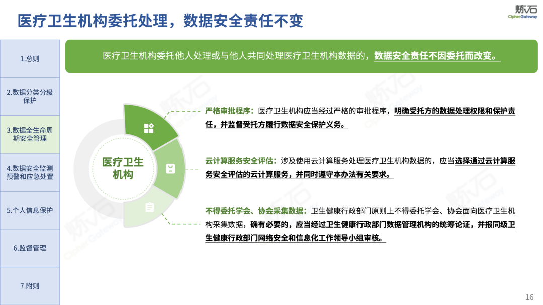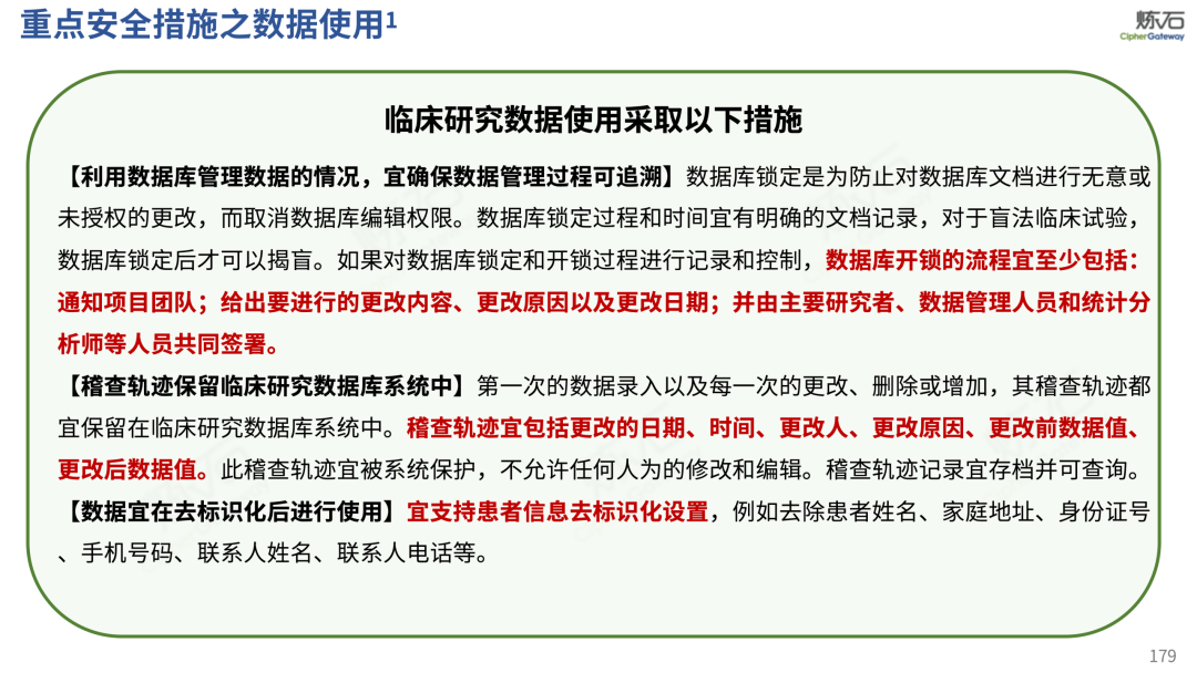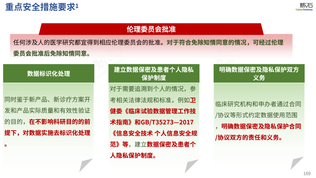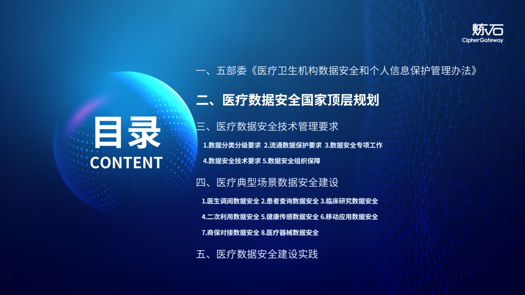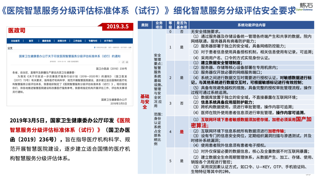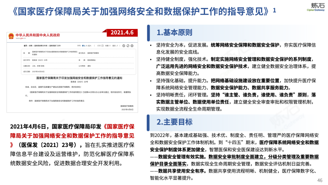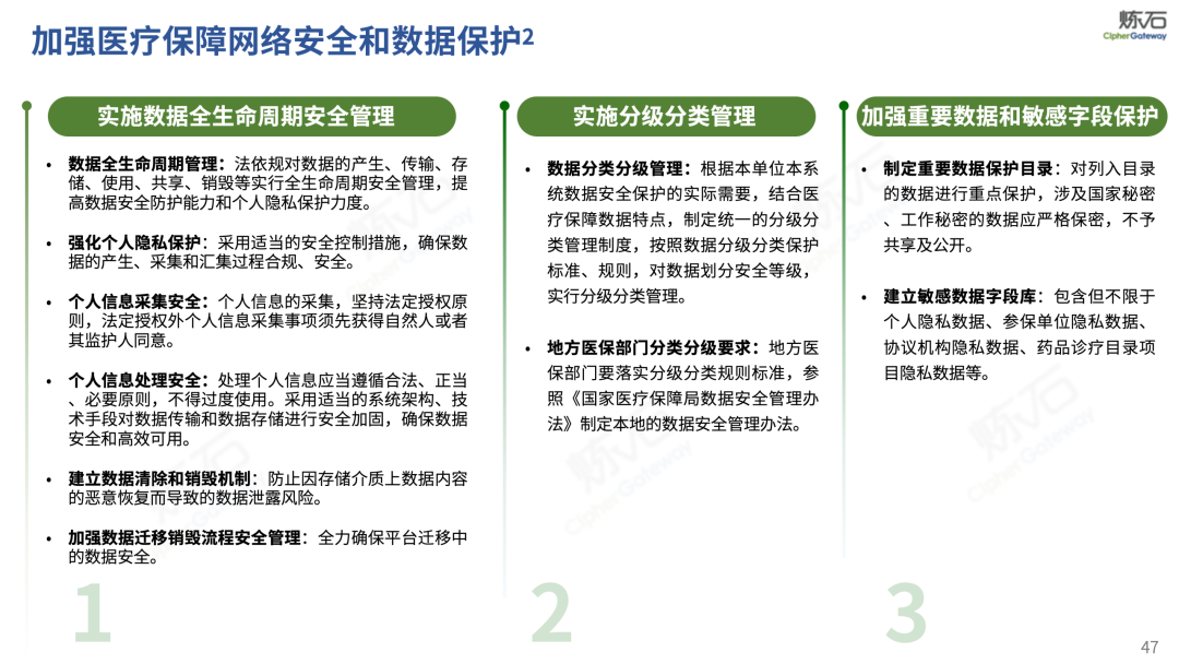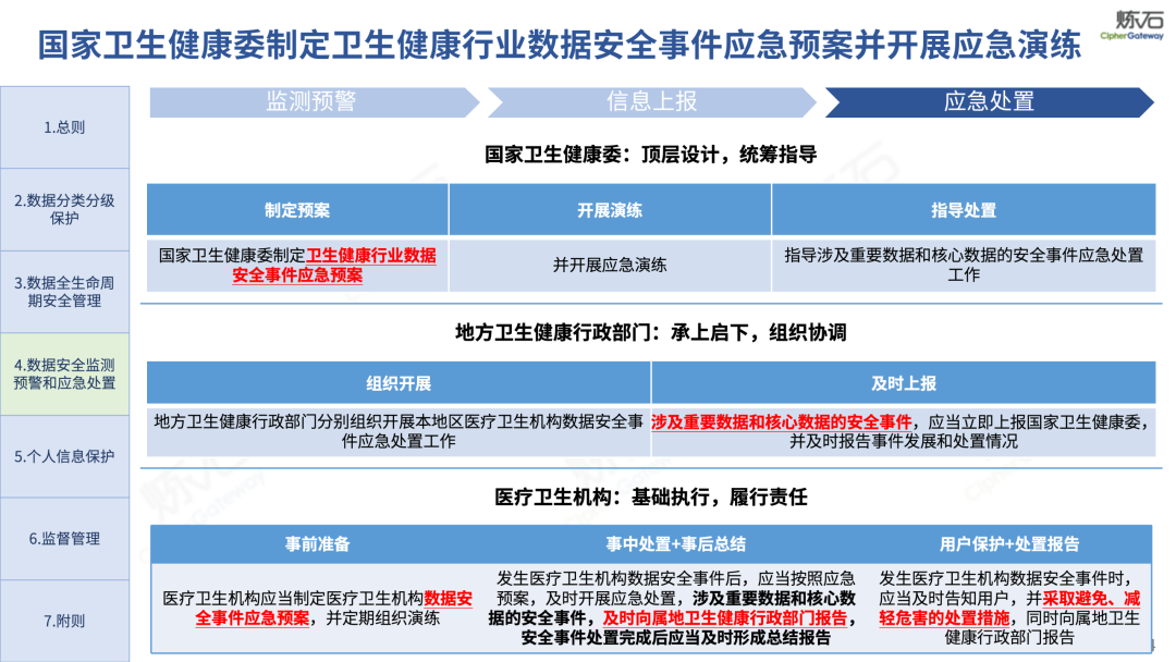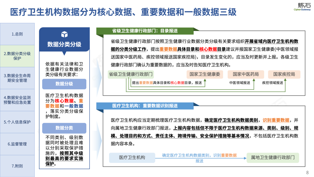 场景为用,落地八大典型安全路径。一图胜千言,炼石以图解形式对《办法》开展系统性解读,聚焦医疗数据安全制度体系,全面梳理医疗行业国家政策、技术与管理要求以及典型场景安全需求,结合医疗卫生安全、电子病历和智慧医疗等国家政策规定,围绕数据分类分级、流通数据保护、数据安全技术和组织管理保障等关键维度,细化医生调阅数据安全、患者查询数据安全、临床研究数据安全、二次利用数据安全、健康传感数据安全、移动应用数据安全、商保对接数据安全、医疗器械数据安全等八大典型场景的安全落地路径。同时,立足医疗行业实践,提炼形成可操作、可落地的医疗数据安全建设方案。