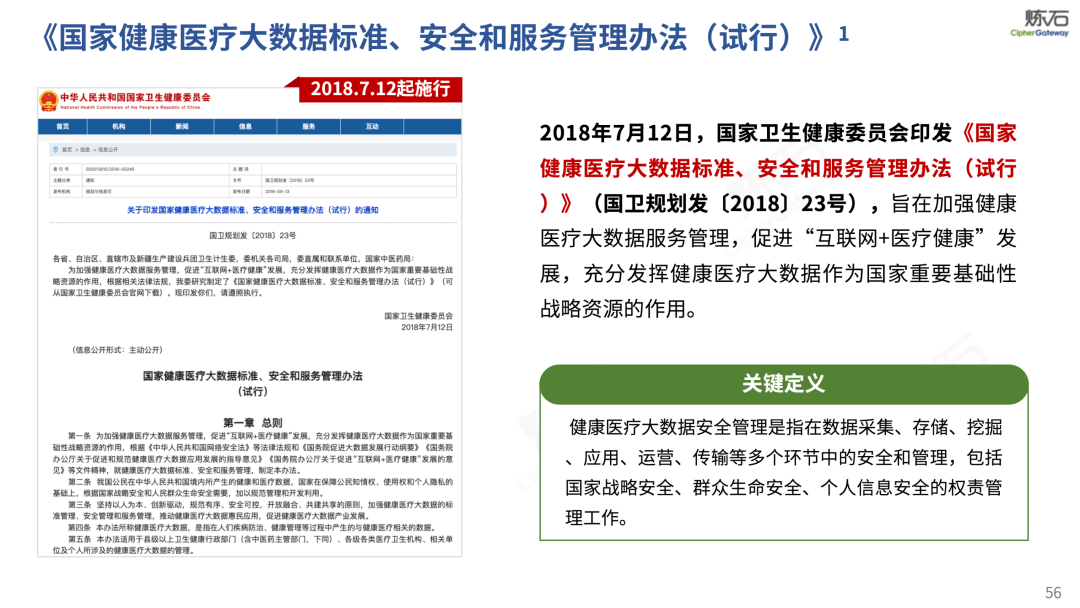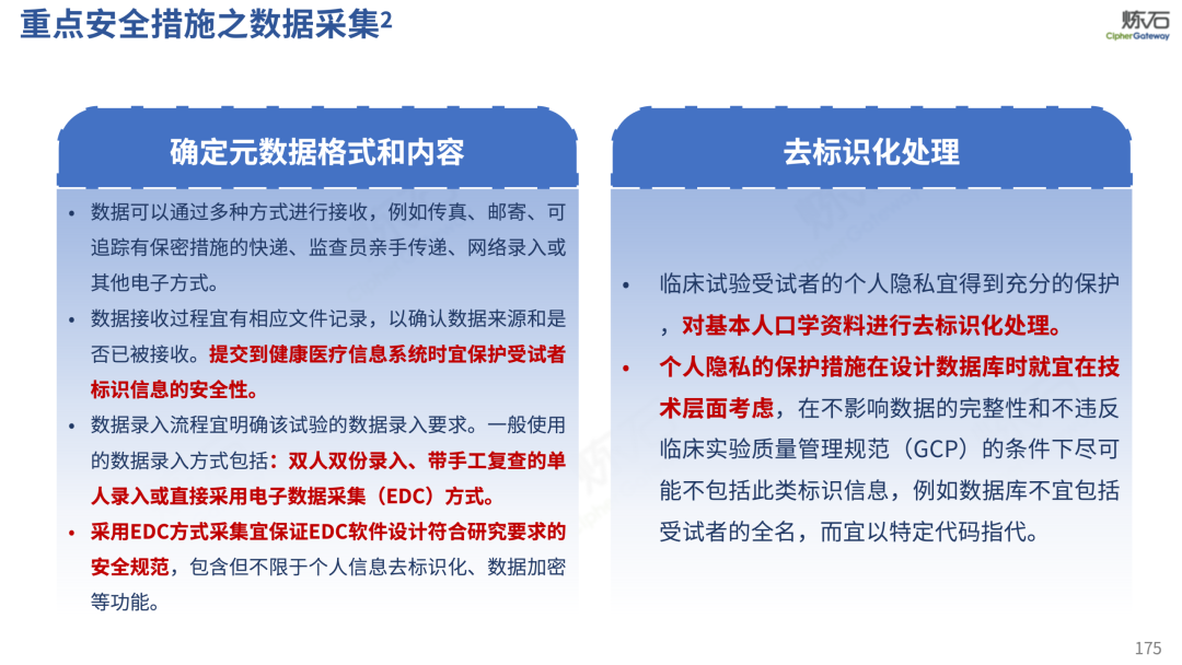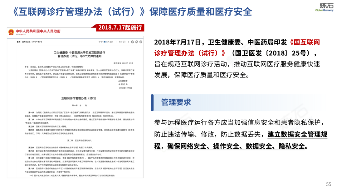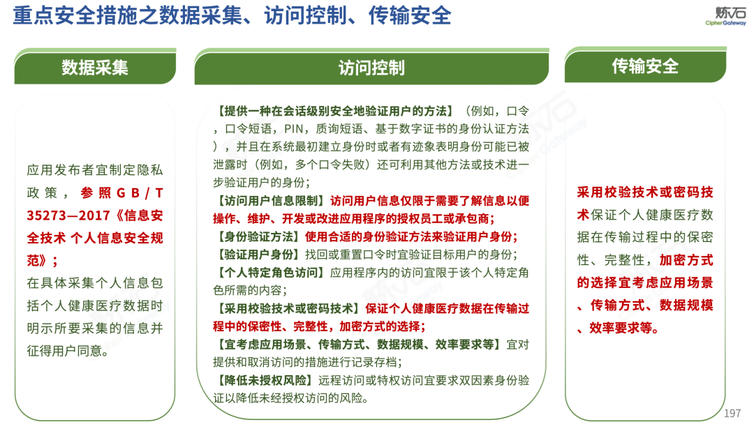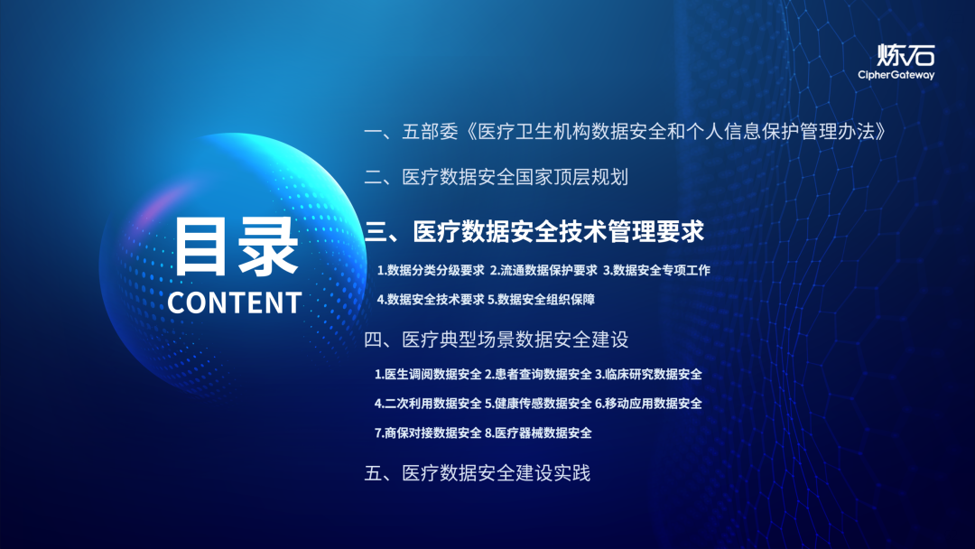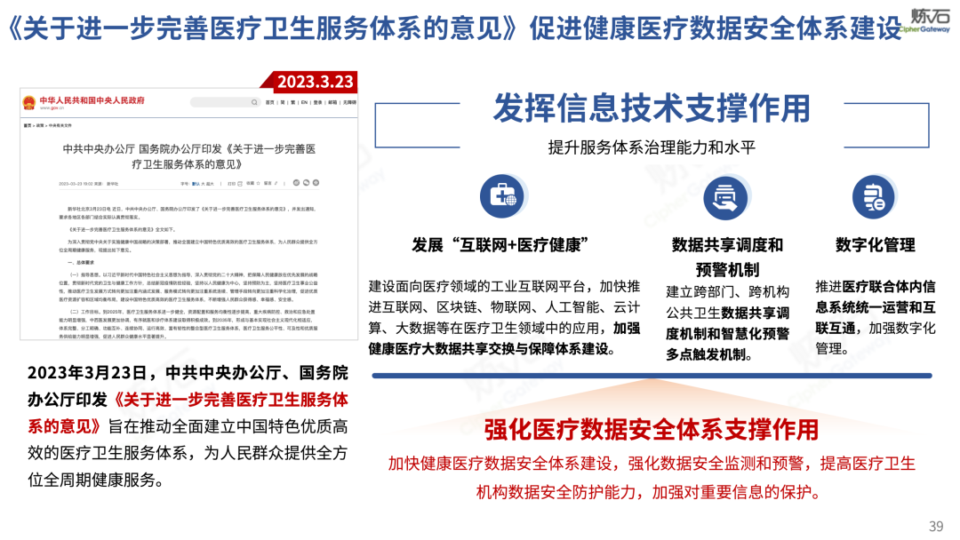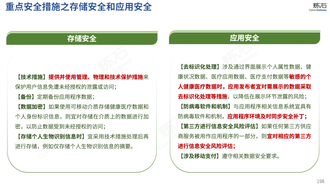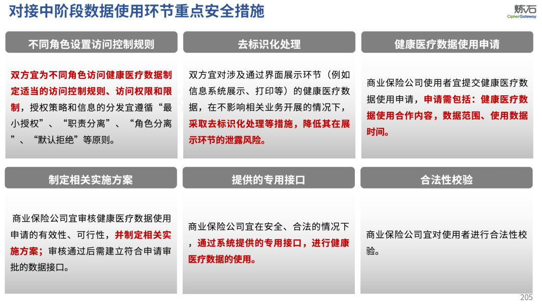 场景为用,落地八大典型安全路径。一图胜千言,炼石以图解形式对《办法》开展系统性解读,聚焦医疗数据安全制度体系,全面梳理医疗行业国家政策、技术与管理要求以及典型场景安全需求,结合医疗卫生安全、电子病历和智慧医疗等国家政策规定,围绕数据分类分级、流通数据保护、数据安全技术和组织管理保障等关键维度,细化医生调阅数据安全、患者查询数据安全、临床研究数据安全、二次利用数据安全、健康传感数据安全、移动应用数据安全、商保对接数据安全、医疗器械数据安全等八大典型场景的安全落地路径。同时,立足医疗行业实践,提炼形成可操作、可落地的医疗数据安全建设方案。