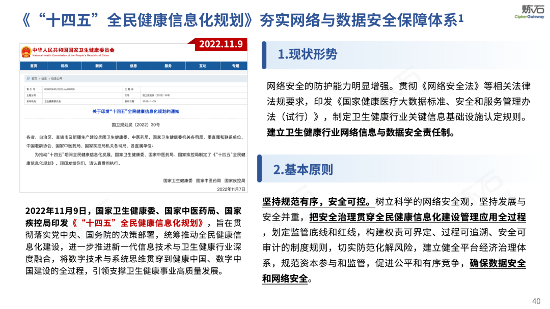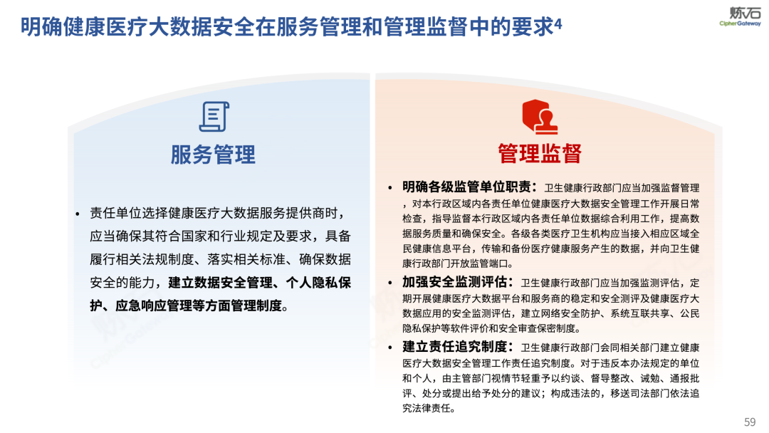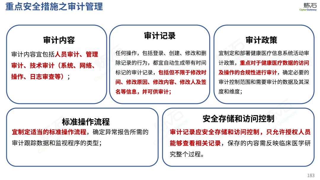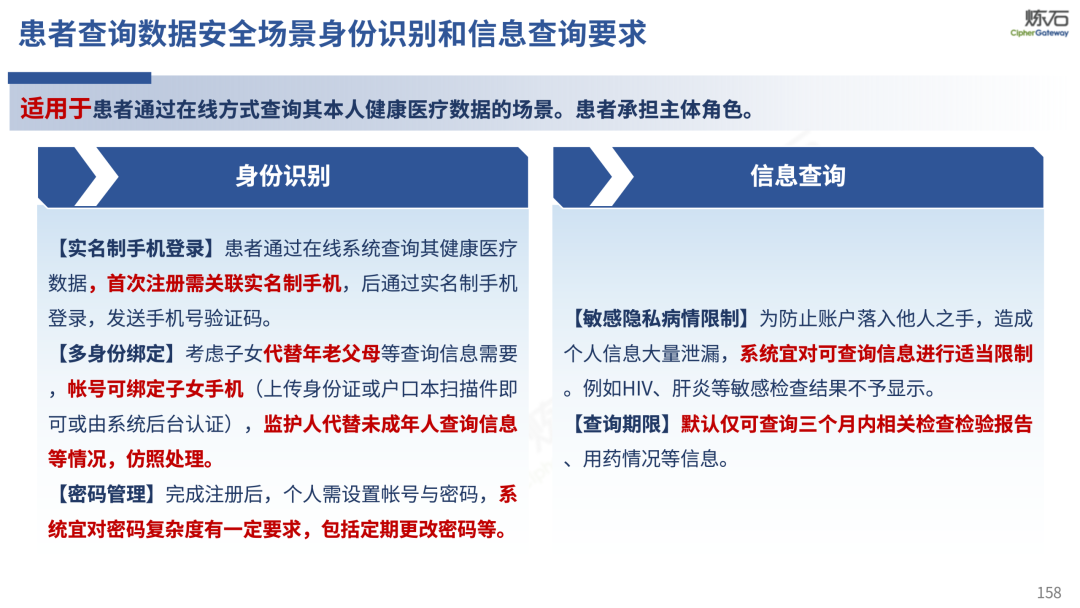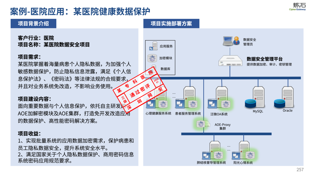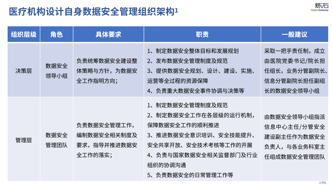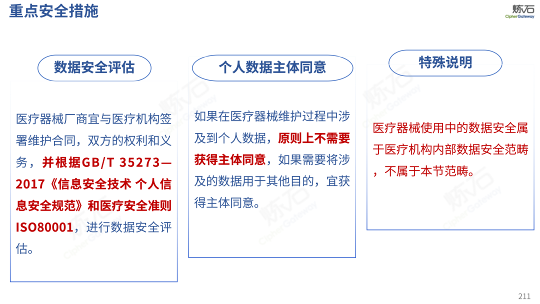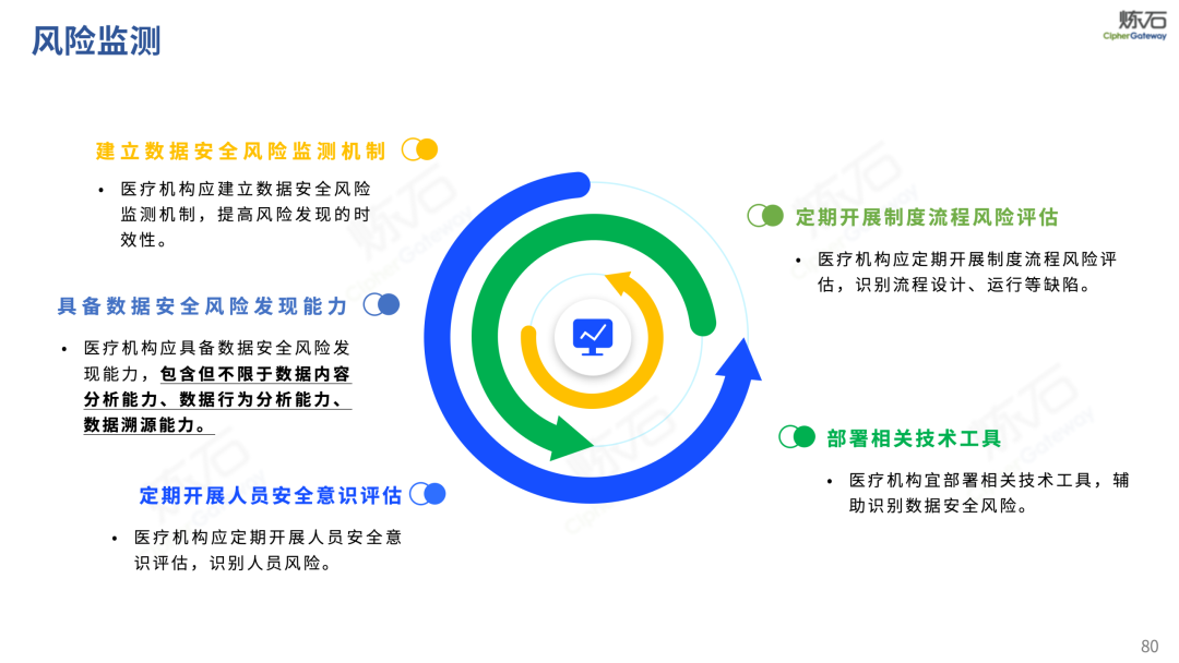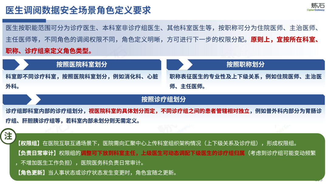场景为用,落地八大典型安全路径。一图胜千言,炼石以图解形式对《办法》开展系统性解读,聚焦医疗数据安全制度体系,全面梳理医疗行业国家政策、技术与管理要求以及典型场景安全需求,结合医疗卫生安全、电子病历和智慧医疗等国家政策规定,围绕数据分类分级、流通数据保护、数据安全技术和组织管理保障等关键维度,细化医生调阅数据安全、患者查询数据安全、临床研究数据安全、二次利用数据安全、健康传感数据安全、移动应用数据安全、商保对接数据安全、医疗器械数据安全等八大典型场景的安全落地路径。同时,立足医疗行业实践,提炼形成可操作、可落地的医疗数据安全建设方案。