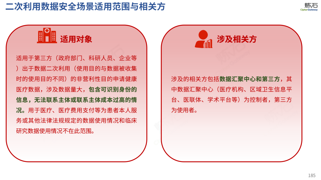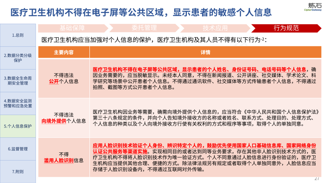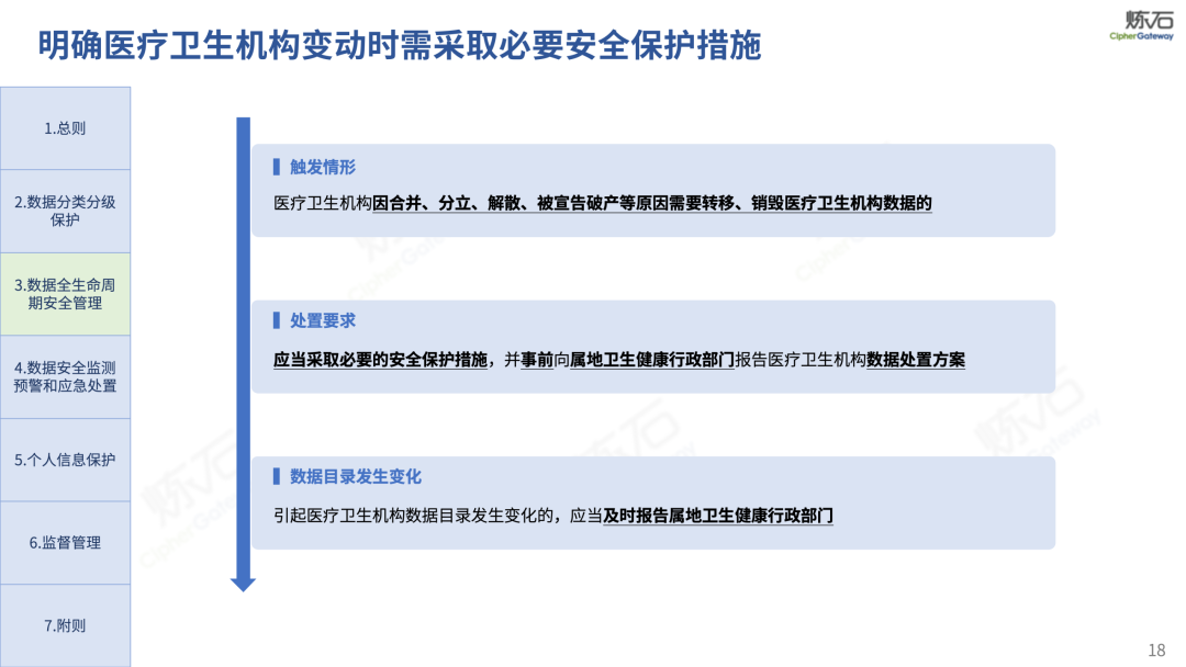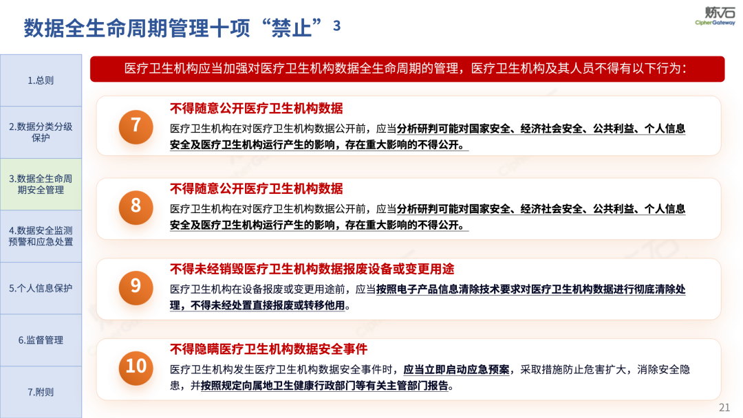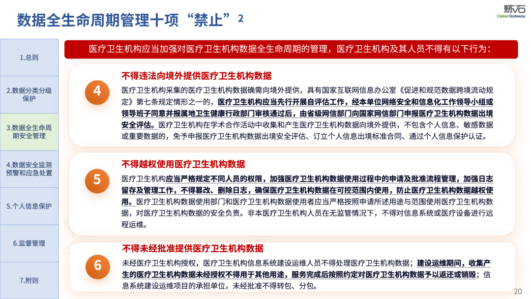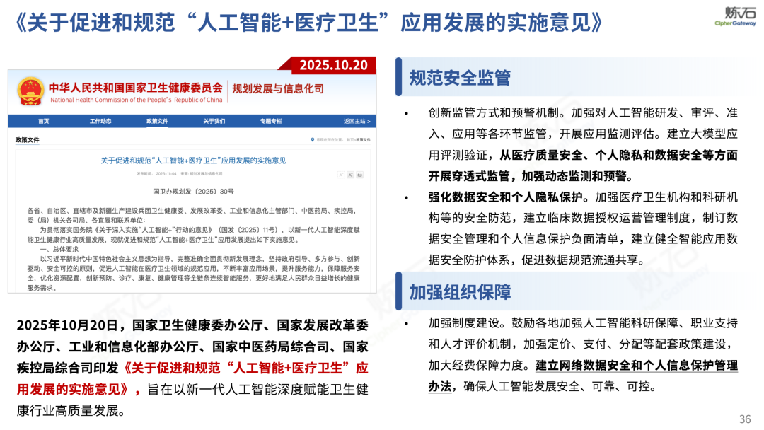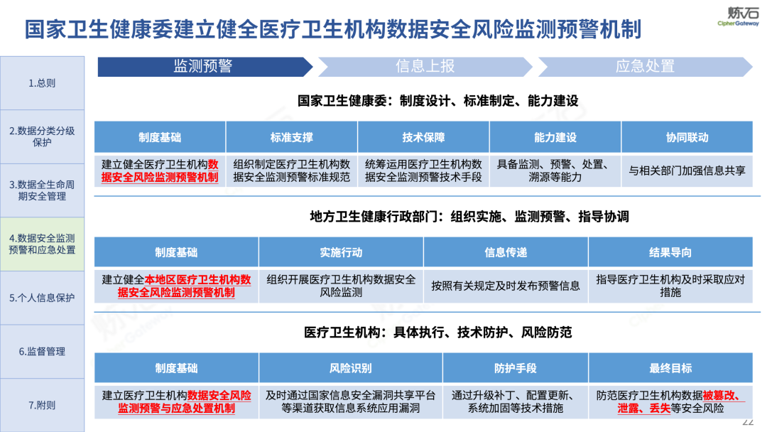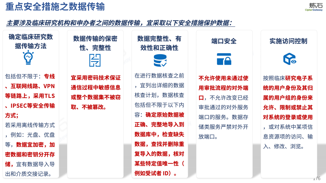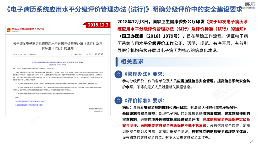 场景为用,落地八大典型安全路径。一图胜千言,炼石以图解形式对《办法》开展系统性解读,聚焦医疗数据安全制度体系,全面梳理医疗行业国家政策、技术与管理要求以及典型场景安全需求,结合医疗卫生安全、电子病历和智慧医疗等国家政策规定,围绕数据分类分级、流通数据保护、数据安全技术和组织管理保障等关键维度,细化医生调阅数据安全、患者查询数据安全、临床研究数据安全、二次利用数据安全、健康传感数据安全、移动应用数据安全、商保对接数据安全、医疗器械数据安全等八大典型场景的安全落地路径。同时,立足医疗行业实践,提炼形成可操作、可落地的医疗数据安全建设方案。