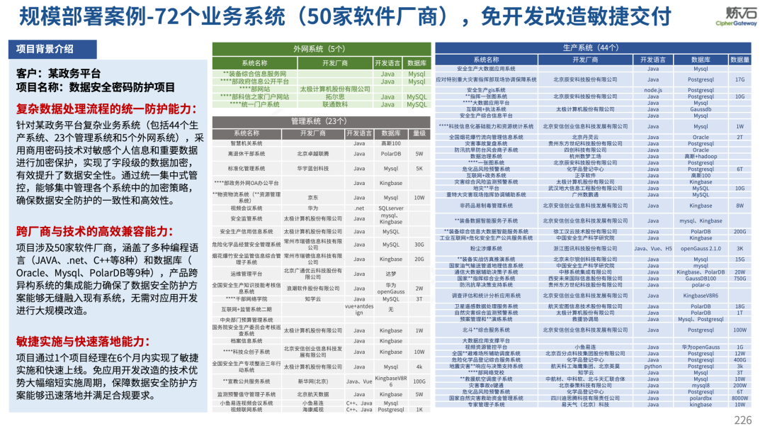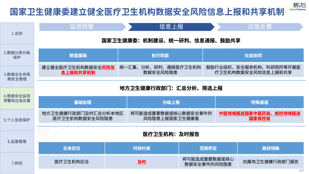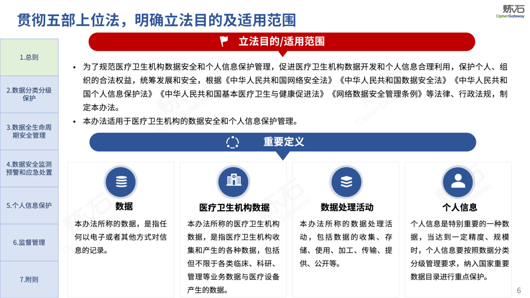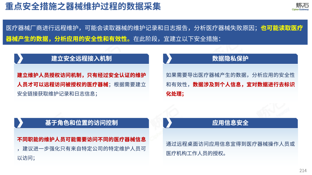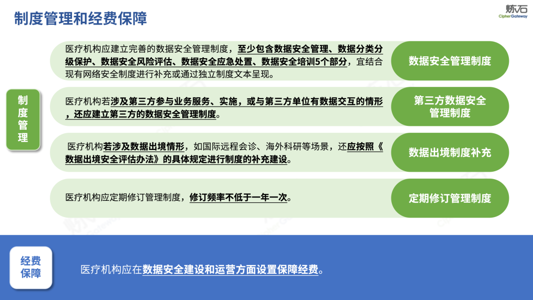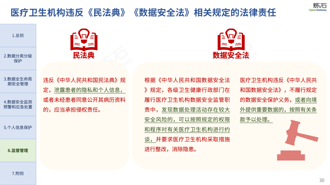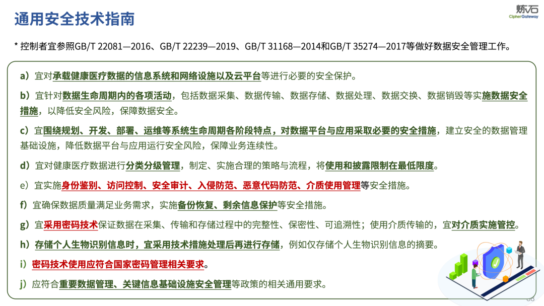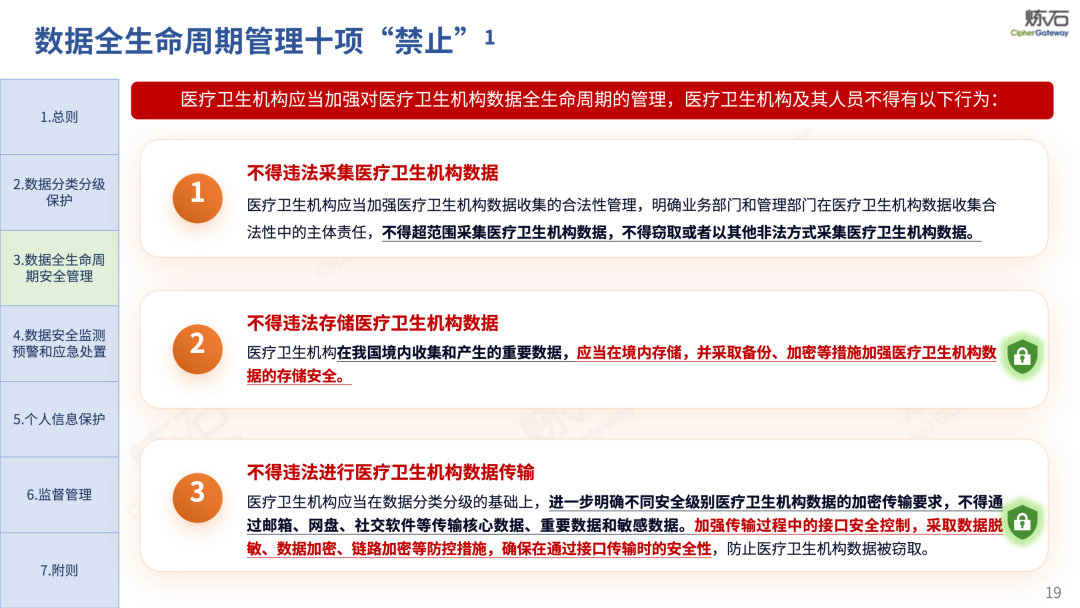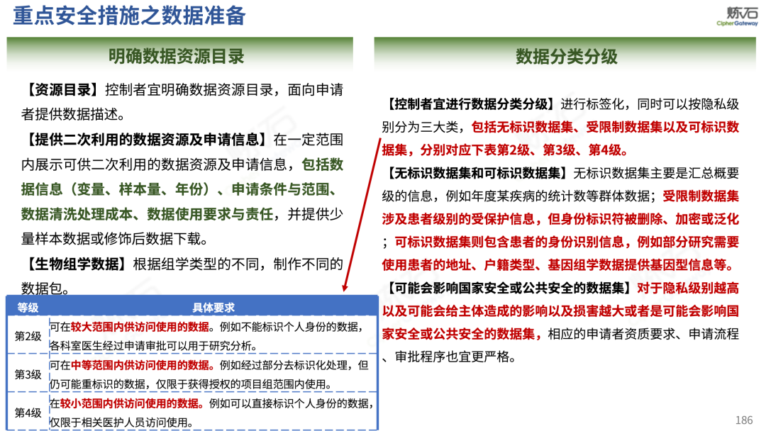 场景为用,落地八大典型安全路径。一图胜千言,炼石以图解形式对《办法》开展系统性解读,聚焦医疗数据安全制度体系,全面梳理医疗行业国家政策、技术与管理要求以及典型场景安全需求,结合医疗卫生安全、电子病历和智慧医疗等国家政策规定,围绕数据分类分级、流通数据保护、数据安全技术和组织管理保障等关键维度,细化医生调阅数据安全、患者查询数据安全、临床研究数据安全、二次利用数据安全、健康传感数据安全、移动应用数据安全、商保对接数据安全、医疗器械数据安全等八大典型场景的安全落地路径。同时,立足医疗行业实践,提炼形成可操作、可落地的医疗数据安全建设方案。