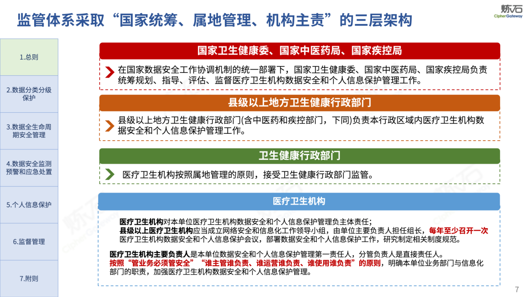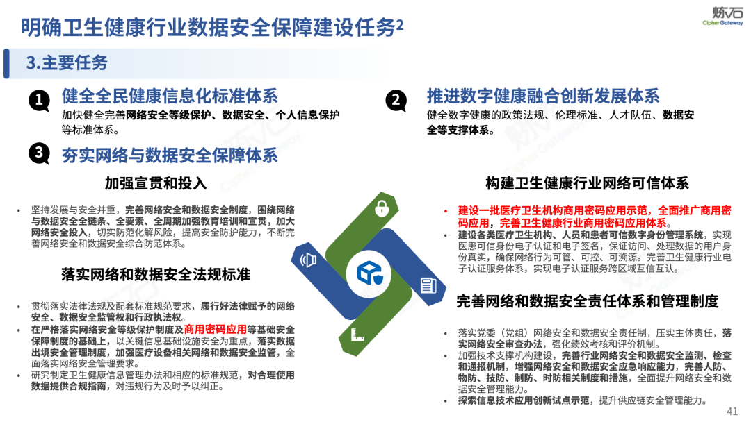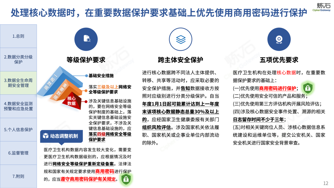 制度为纲,构建全生命周期安全防护体系。《办法》立足医疗卫生行业数据特性与安全需求,贯彻落实《网络安全法》《数据安全法》《个人信息保护法》《基本医疗卫生与健康促进法》《网络数据安全管理条例》等上位法,明确医疗数据分类分级、全生命周期安全管理、个人信息保护、监测预警与应急处置、监督管理等核心要求,确立 “谁主管谁负责、谁运营谁负责、谁使用谁负责”的责任原则与“核心、重要、一般”三级数据分级规则,将合规要求深度融入医疗业务全流程。同时,《办法》突出技术防护核心作用,将商用密码提到重要高度,要求医疗卫生机构在处理核心数据时,在重要数据保护要求的基础上,优先使用商用密码进行保护。明确在数据存储、传输等关键环节采取加密等安全措施,细化个人信息处理合规要求,对数据对外提供、跨境传输做出专项规范,建立健全安全事件应急响应机制,统筹推进医疗数据开发利用与安全保障。