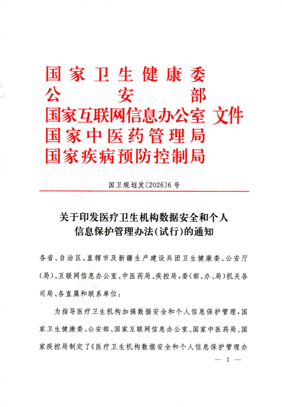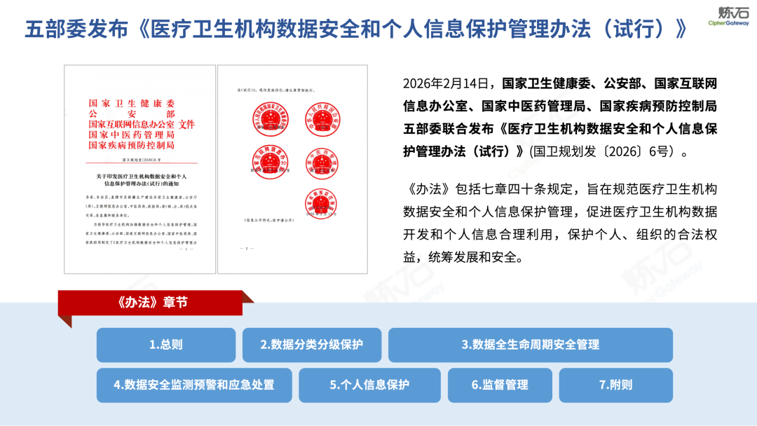 立法为基,筑牢健康中国数字安全防线。2026年2月14日,为指导医疗卫生机构加强数据安全和个人信息保护管理,国家卫生健康委、公安部、国家互联网信息办公室、国家中医药管理局、国家疾病预防控制局五部委联合印发《医疗卫生机构数据安全和个人信息保护管理办法(试行)》。《办法》作为“十五五”开局之年医疗数据安全领域的重要新规,共七章四十条,以专项制度规范医疗数据全生命周期管理与个人信息保护,推动医疗数据治理从原则倡导迈向刚性制度约束,在新发展阶段为加快建设健康中国筑牢数字安全屏障。