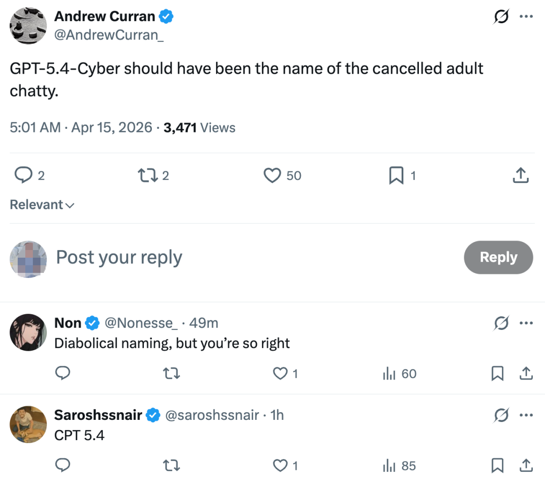 不过呢,这个模型的命名遭到了不少人的吐槽,「GPT-5.4-Cyber 这个名字听起来更像是一个被砍掉的成人聊天产品的名字。」