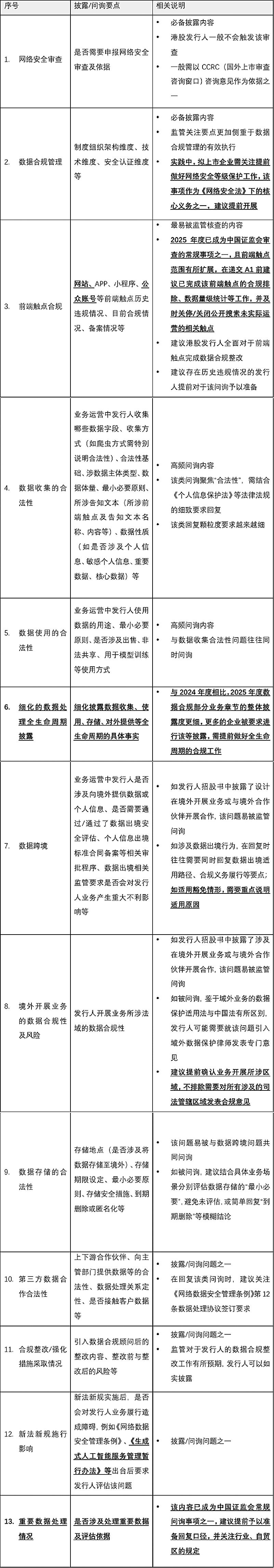 在剖析各行业特殊的合规问询前,必须先夯实所有行业通用的数据合规基座。因此,我们结合本年度参与港股IPO数据合规项目的实战经验,对《2024-2025年度IPO数据合规观察报告》总结的通用要点进行了迭代。