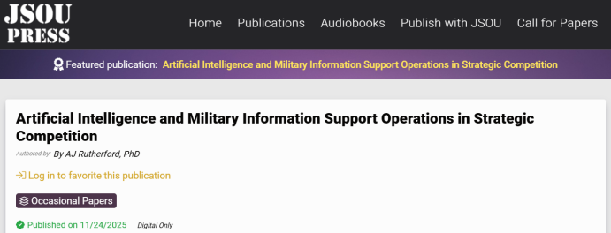 人工智能与军事信息支持在战略竞争中的作用2025年11月24日,美国联合特种作战大学网站发布报告《人工智能与军事信息支持在战略竞争中的作用》,详细阐述了人工智能驱动的认知战技术如何通过自然语言生成、情感分析和心理图谱分析等先进能力,使现代军事信息支持行动(MI