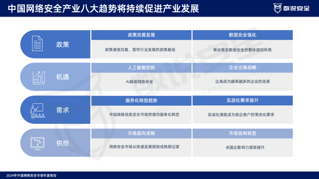 2024年中国网络安全八大宏观趋势数说安全为大家总结出了2024年中国网络安全产业八大趋势,该八大趋势代表了我国网络安全产业的最新动向与趋势方向,将持续促进产业发展。